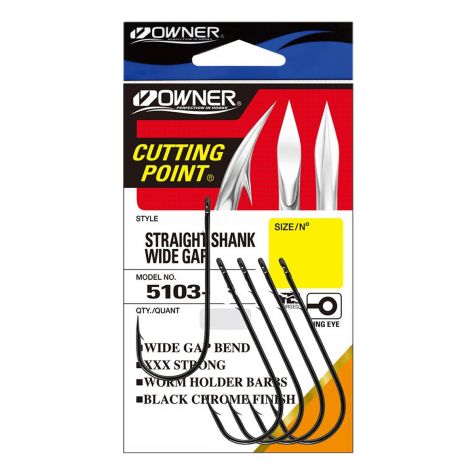 El anzuelo Owner Straight Shank Wide Gap 5103 se caracteriza por tener una curvatura redondeada, una punta de tres filos gracias a la tecnología patentada Cutting Point, y un acabado en negro cromado anticorrosivo. Este anzuelo además dispone de dos salientes (trabas) en la parte interior de la caña, que ayudan a evitar el desprendimiento de carnada, posee fortaleza 2X Strong.