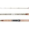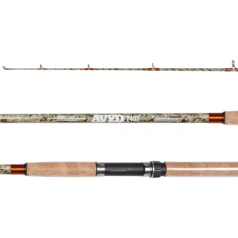 Caña de pesca ideal para vairada de costa de rio o embarcado, diseño de color verde camuflado, con hilado en naranja metalico.