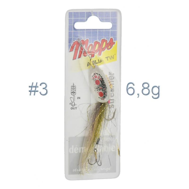 Los señuelos Mepps AGLIA TW STREAMER combinan la sutil acción de un streamer nadador, especialmente atado según las reglas del spinning. Además, la vibración del cuerpo del Aglia aumenta significativamente su efectividad. El streamer se ata a una varilla flexible con un anzuelo frontal simple y uno triple. Está formado por largas fibras en más de diez colores de señal diferentes. Los ojos, las branquias rojo intenso, la línea lateral y el microbrillo en todo el cuerpo son claramente visibles.
