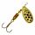 Las palas MEPPS Aglia PTS. Si bien los pescadores experimentados reconocen la utilidad de esta coloración, discrepan sobre las razones de su efectividad. Algunos creen que los puntos realzan el contraste de la pala, provocando así los ataques de los peces. Citan la eficacia del Aglia PTS en aguas turbias como prueba de ello. Otros, por el contrario, creen que estos mismos puntos, al girar, se fusionan en líneas suaves, creando una coloración más tenue, menos alarmante para los peces y confiriéndole al señuelo una apariencia de insecto. Las palas Aglia PTS están disponibles en plata, oro y cobre. Siempre encontrará la combinación ideal para sus condiciones. Al girar, el ángulo de desviación del pétalo respecto al eje es de 60 grados.