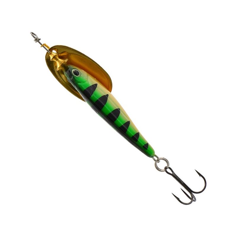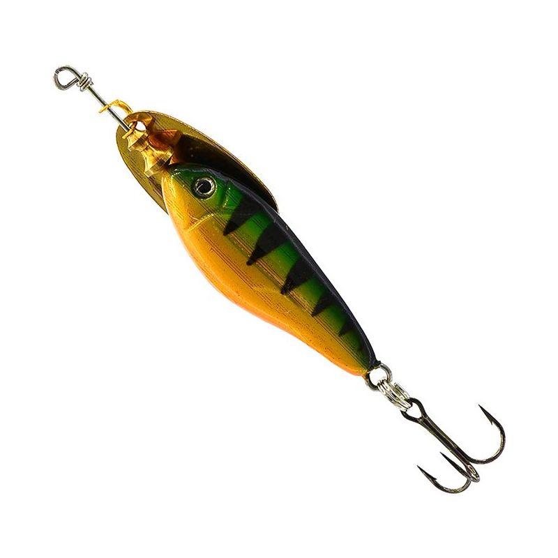 Acción rapida de minnow con cuchara giratoria. La acción rapida del señuelo del cuerpo de madera de balsa combinada con el tentador destello de un spinner en línea hace que esta sea una combinación muy efectiva.