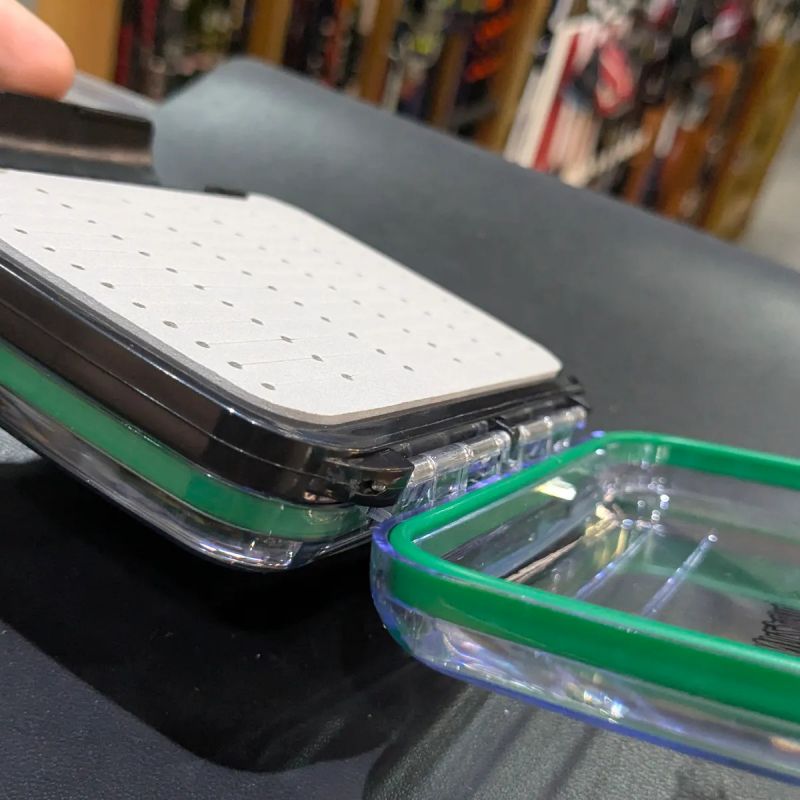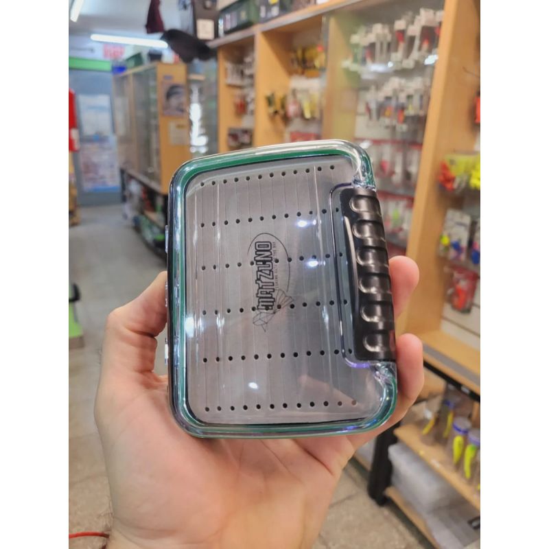 Caja porta moscas Matzuno modelo h0806, diseñada para pescadores que buscan máxima protección y organización. Fabricada en plástico reforzado de alta resistencia con tapas transparentes que permiten visualizar el contenido de ambos lados sin necesidad de abrirla.