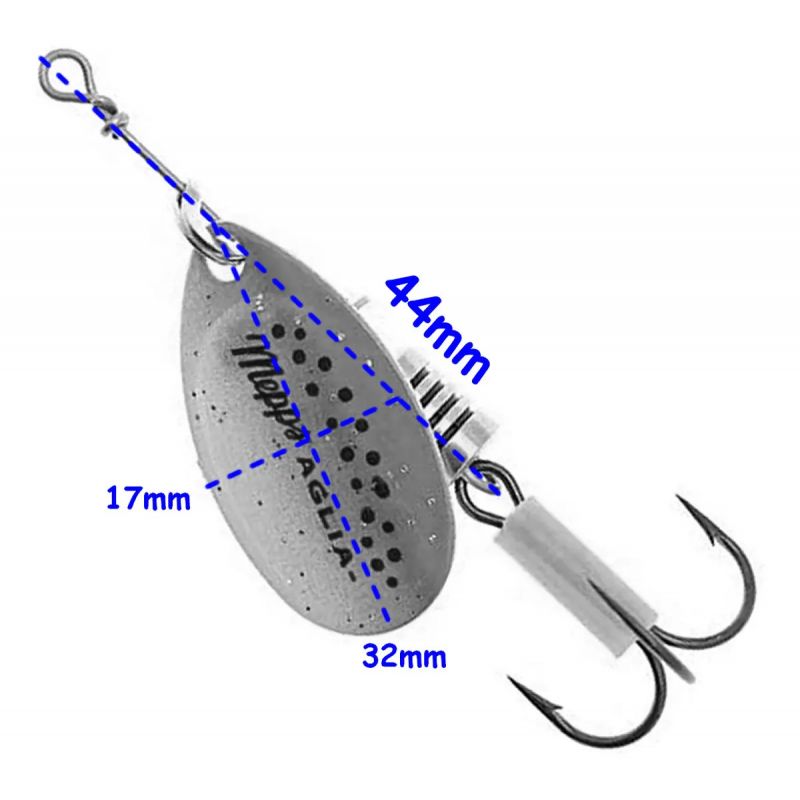 El esquema de colores AGLIA Trout de MEPPS es una incorporación relativamente nueva. No imita una masa de agua específica, sino una combinación de elementos reflectantes que provocan el ataque de los depredadores. La superficie exterior de la hoja se asemeja a la coloración de una trucha de arroyo. Sin embargo, esta no es su principal característica distintiva. Al girar la hoja de esta cucharilla, los colores de imitación se pierden. Simplemente aportan matices distintivos al señuelo en movimiento. El principal elemento reflectante en la superficie exterior de la hoja es un fino cristalino con un 100% de reflexión de la luz. Bajo el agua, múltiples microseñales, características de presas conocidas, provocan aún más a los depredadores. La superficie interior de la hoja es plateada (trucha arcoiris) y dorada (trucha marron). Las pruebas de estos señuelos en aguas dulces han recibido excelentes críticas de numerosos pescadores. Dado que el Rainbow está disponible en todos los tamaños estándar de AGLIA, es apto para la pesca de spinning con la mayoría de las especies.